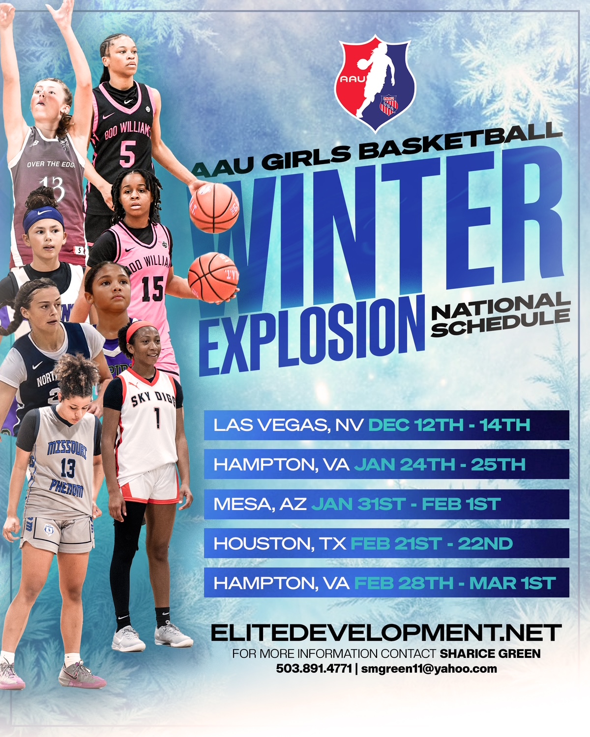 Events 2025 AZAAU SPORTS FESTIVAL Celebrates #sportsforallforever!!! Phoenix Convention Center December 12-14 MORE INFORMATION COMING SOON 2025 Winter Explosion - Girls Basketball - Las Vegas, NV Dec 12 - 14 2026 Winter Explosion - Girls Basketball - Hampton, VA January 24 - 25 2026 Winter Explosion - Girls Basketball - Mesa, AZ - January 31 - Feb. 1 2026 Winter Explosion - Girls Basketball - Houston, TX - February 21 - 22 2026 Winter Explosion - Girls Basketball - Hampton, VA - February 28 - March 1
